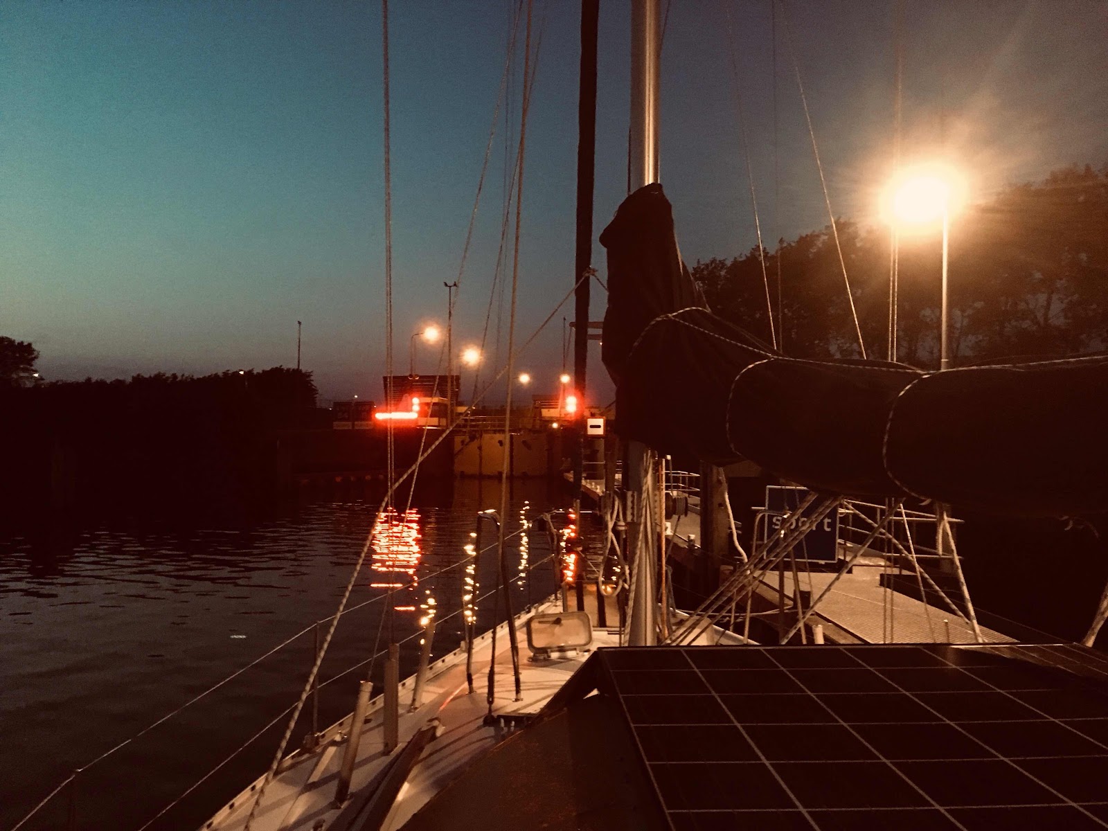 Wachten voor de sluis die morgenvroeg 07:00 uur open gaat en waar wij de sprong nemen de Noordzee op naar de Oostzee.
