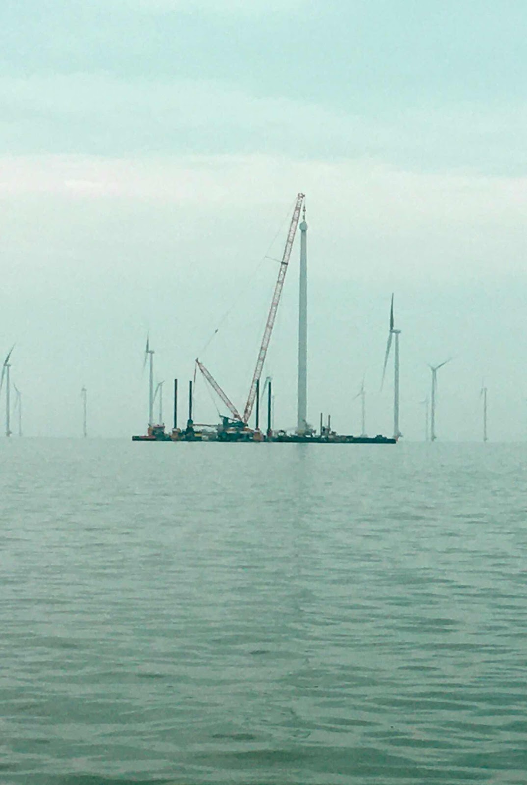 De wind is gunstig en de windkracht is tussen de vijf en acht knopen, en als we buiten de havenkom de motor weer uitzetten varen we alleen op de genua een koersje van 210 graden en dat is precies naar de hoek van het gigantische windpark waar ze nog mee aan het bouwen zijn.