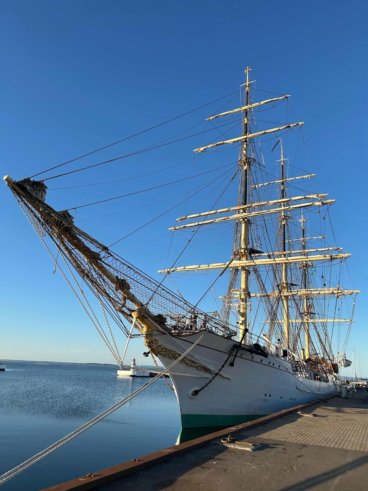 Dan maken we ons op voor een wandeling naar het Deense Marineopleidingschip wat aan de andere kant van de haven ligt, en dat is een driemaster van een meter of 80 lang schat ik het is de DANMARKEN.