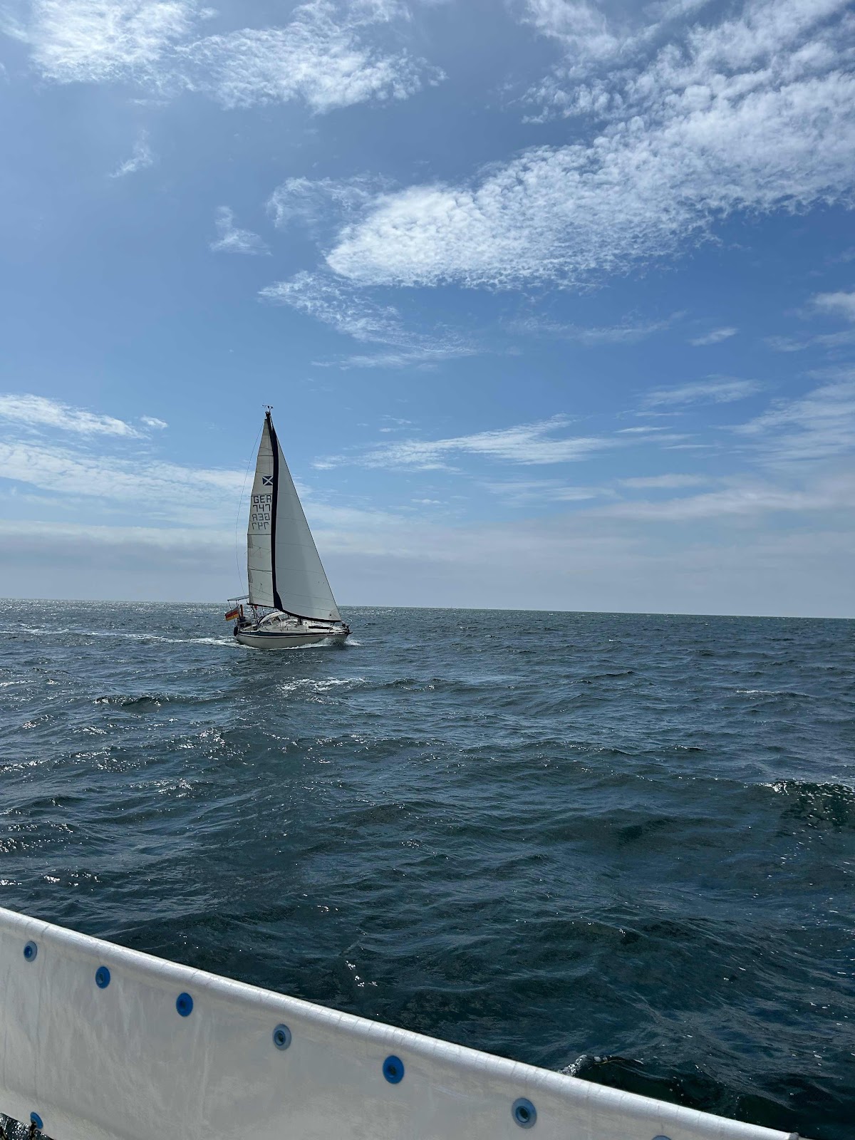Een aantal keren komen we een zeiljacht op tegenkoers tegen, maar verder is het erg rustig op zee.